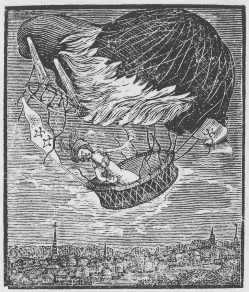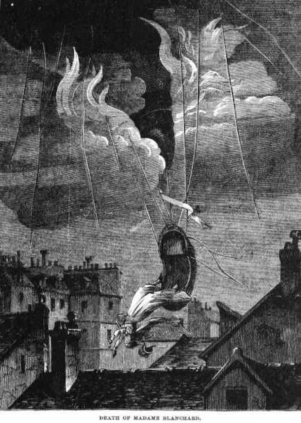 Her last flight was in Paris, on the 6th of July, 1819, when one of her fireworks somehow “took a perpendicular direction to the balloon and set fire to it.”