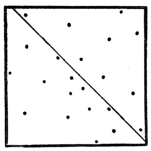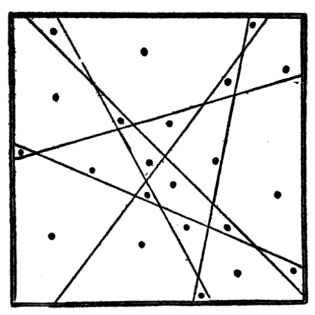 There is a plot of ground with 22 trees on it. Build a series of fences using only six straight lines so that you can not walk from one tree to another without climbing a fence. Each dot should be in its own enclosure.